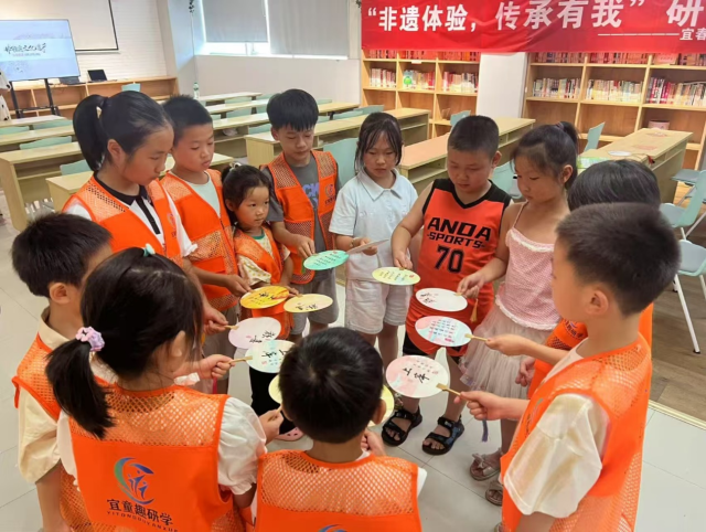 活动当天,孩子们满怀好奇地走进袁州区文明实践中心,开启一场与漆器文化的美好邂逅。服务队成员聚焦漆器技艺的发展历程展开讲解,从唐宋袁州漆器作为贡品的荣光,到明清时期漆器“薄如纸、亮如镜”的工艺巅峰,再到现代漆器技艺与扇文化的巧妙融合,正是一代代传承人的使命坚守,才能让这门古老技艺历经岁月依旧闪耀。在成员们的耐心指导下,孩子们兴致勃勃地开启了漆扇绘制的奇妙之旅。从挑选心仪的扇面,到调配五彩斑斓的颜料,再到小心翼翼地进行点染、勾勒,每一个步骤都充满了乐趣与挑战。当孩子们握着白色扇面慢慢伸进漆水,再缓缓提起来时,眼前便出现了神奇的变化:漆水退去后,扇面忽然像映着晚霞一样绚烂,忽然又像泛起碧波一样清幽。一柄柄亲手绘制的漆扇相继完成,斑斓的色彩在光线下流转生辉,温润的光泽触手可及。扇面轻摇,带来的不仅是习习凉风,更是亲手体验非遗文化的自豪与满足。