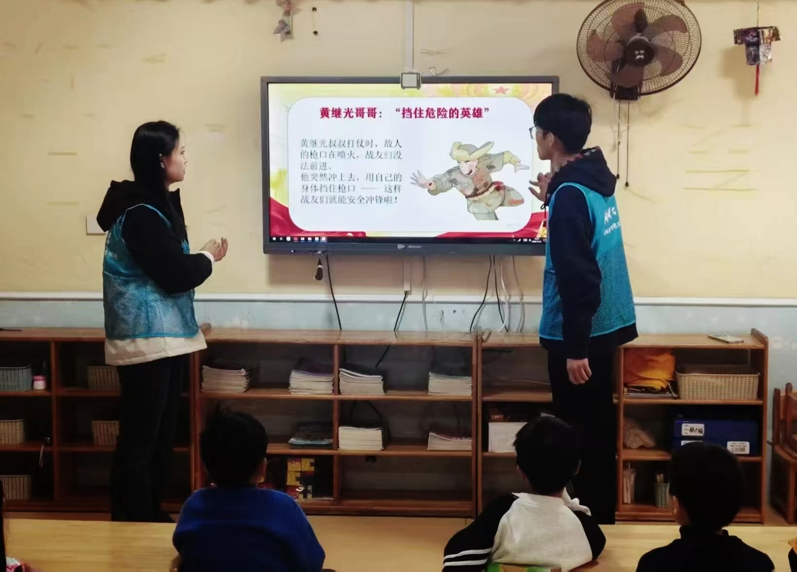 活动伊始,志愿者们借助图文并茂的 PPT,以童趣化语言铺开抗美援朝历史长卷:从战争背景的通俗解读,到关键阶段的生动梳理,再到黄继光、邱少云等英雄事迹的细致讲述,志愿者们将英雄们舍生忘死的奉献精神与保家卫国的赤诚担当转化为小朋友听得懂、能共情的成长养分,引导孩子们深切感悟英雄精神的重量。随后,志愿者们手把手教小朋友们折叠象征荣誉与信仰的“五角星”,引导他们将对英雄的敬意、对祖国的热爱融入每一个棱角、每一道褶皱中。活动尾声,志愿者们与小朋友暖心交流,鼓励大家从整理书包、帮助同学等身边小事做起,把英雄品质落到实处,用点滴行动践行爱国情怀。