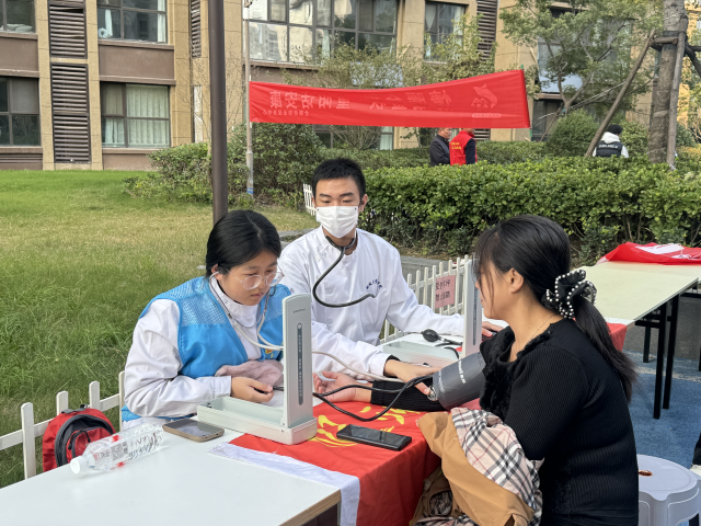 活动现场设置了专门的健康服务站,为社区居民保驾护航,学员们带着专业热忱与敬老之心耐心为每一位居民免费测量血压,并细致询问居民日常饮食、用药情况,针对血压异常的老人,学员们结合医学知识为他们制定了个性化的饮食调整、作息规划等健康建议,帮助他们远离潜在的健康风险。活动现场,学员们的热情服务与社区老人的欢声笑语交织一起,营造出温馨和谐的秋日暖景。 同时,现场还上演了精彩的传统文化表演,活力十足的舞狮表演点燃社区氛围,随后的太极拳展示则以舒展柔和的动作,传递“动静结合、养生健体”的健康理念,丰富了社区居民的精神文化生活。