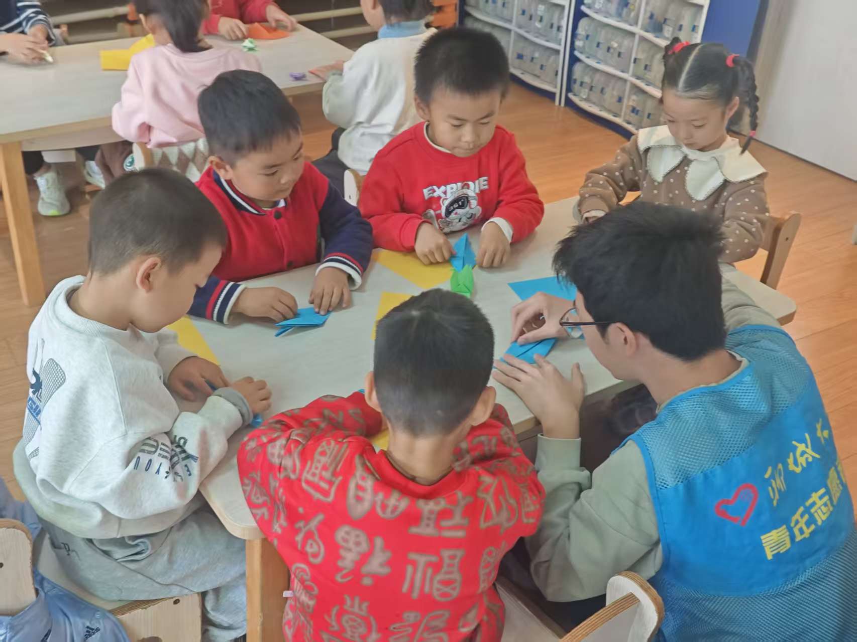 活动开始,志愿者们展示的青蛙、千纸鹤等精美折纸成品,瞬间吸引了孩子们的目光。随后,志愿者们以生动有趣的语言,向幼儿园的孩子们讲述了折纸艺术的起源、历史发展及非物质文化遗产的独特价值,从古代纸张发明到技艺的世界传播,让孩子们了解到小小纸片背后的文化底蕴与创造魅力。实践环节中,志愿者们分组开展教学,针对孩子们的年龄特点选取难度适中的折纸造型。志愿者们耐心细致地手把手教学,确保每个孩子都能顺利完成作品。当一只只灵动的折纸作品在手中诞生,孩子们脸上洋溢着成功的喜悦,教室里充满欢声笑语。活动结束后,志愿者们纷纷表示,在手把手指导孩子们探索折纸艺术的过程中,不仅收获了满满的成就感和幸福感,更深刻体会到志愿服务的价值与温度。