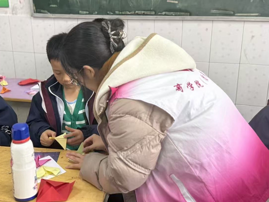 活动期间,志愿者以“感恩”为核心有序推进流程,开场即通过故事宣讲与互动引导,帮助小学生理解感恩的内涵。在此基础上,志愿者两人一组,在手工实践环节中手把手指导小学生折制千纸鹤、爱心、郁金香等折纸装饰,并协助其完成感恩贺卡创作。孩子们结合生活体验,或在贺卡上绘制全家福、教师授课场景,或书写“妈妈您辛苦了”“谢谢老师”等真挚话语,将纯粹心意融入一折一画之间。
