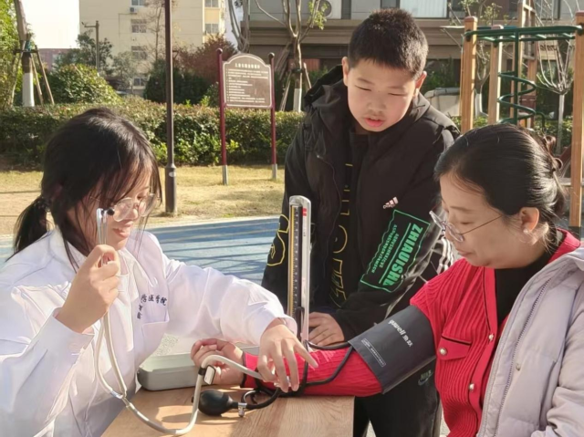为响应全民健康行动号召,进一步提升社区居民健康管理意识,11月29日,医学院2024级5班团支部走进祥生·金鳞府社区开展“医路守护,血压护航”志愿测血压活动。活动通过免费血压测量、健康咨询及慢性病管理指导,为社区居民送上冬日健康关怀,吸引社区居民参与。