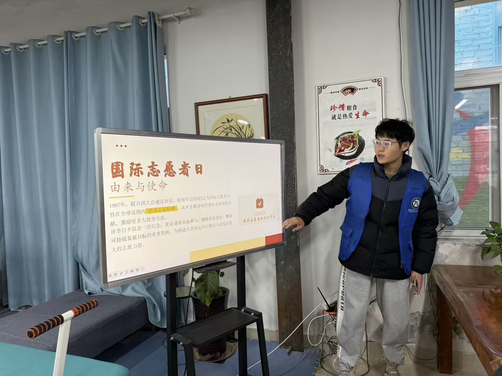 活动伊始,团队以国际志愿者日为背景,向老人们细致介绍了该节日的起源与重要意义,让老人们对志愿服务精神有了更深的认知。随后,成员们精心编排了温馨短剧,还摆开棋盘与老人切磋象棋,又携手合唱经典老歌,多样互动形式瞬间打破隔阂,现场氛围愈发融洽。活动中,团队主动引导老人展示戏曲、书法等个人才艺,耐心倾听他们的过往故事,既促进了情感联结,又极大提升了老人们的参与热情。活动最后,成员们分组对老年公寓的公共区域、起居空间、户外活动区域开展系统清扫与整理,从擦拭桌椅到规整杂物,每个细节都尽显对老人们的真诚关怀与志愿服务精神。