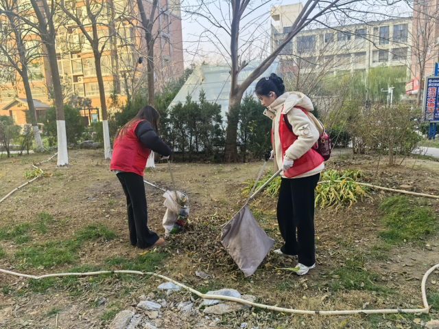活动现场,志愿者们采取“清理、转化、宣传”相结合的方式开展环境卫生整治。大家分工明确,相互配合、高效推进,他们手持扫帚、垃圾夹、环保袋等工具,对社区道路、绿化带、公共活动区等区域进行全面清理,仔细拾捡落叶与散落垃圾,并专门设置落叶堆肥点,将收集的落叶转化为“社区生态肥料”,实现资源循环利用。同时,志愿者们也积极向居民讲解落叶堆肥的意义与方法,传递节约资源、爱护环境的绿色理念。
