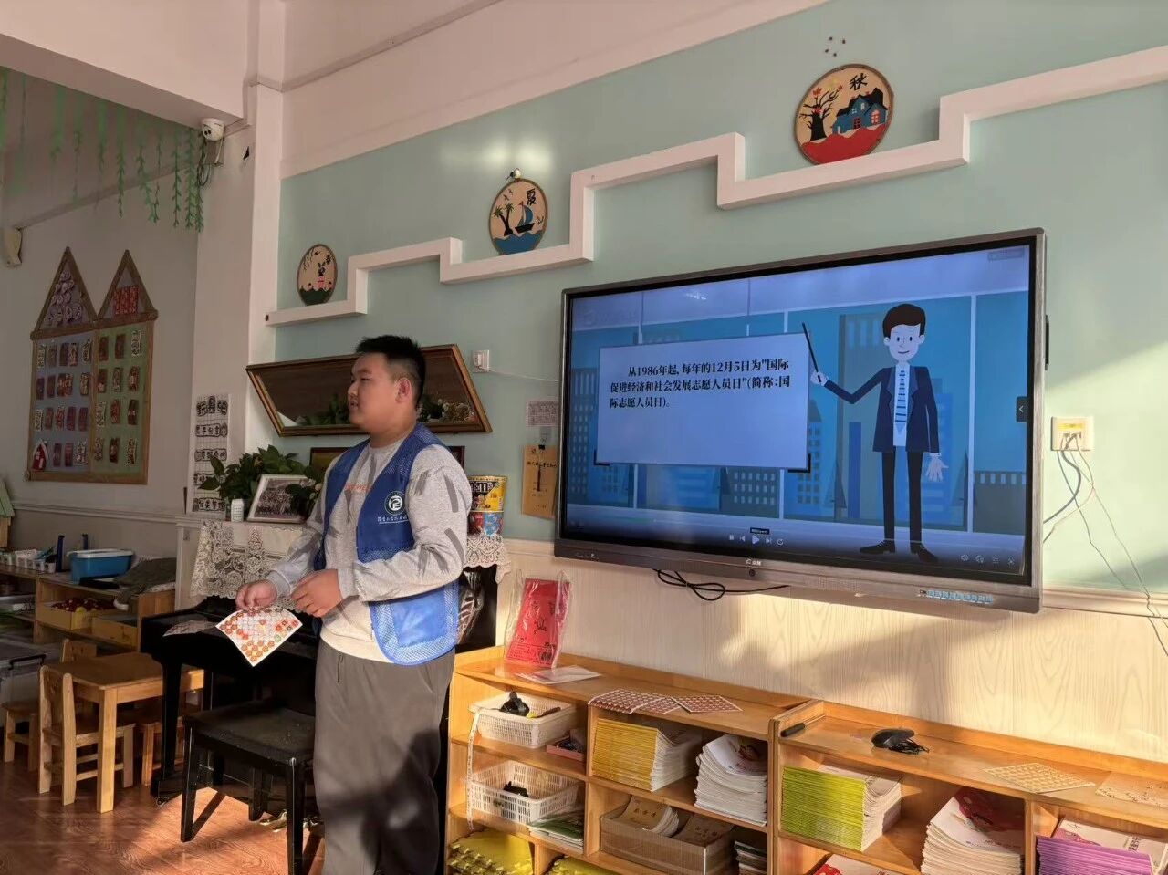 接着,团队成员设计了趣味问答环节,充分调动了小朋友的参与积极性,深化了他们对志愿服务的社会价值的认知与理解。活动结束后,幼儿园负责人表示,此次活动让小朋友感受到了奉献的价值与互助的温暖,为培育他们向善向美的优良品格奠定了良好基础。活动伊始,团队成员以志愿精神主题动画为切入点,结合国际志愿者日向小朋友讲解了志愿者的精神内核,传递了甘于奉献、友爱他人的价值理念。随后,团队成员带领小朋友制作了爱心贺卡,鼓励小朋友用画笔书写祝福,并将亲手制作的贺卡赠予老师,让小朋友领会了感恩与分享的意义。