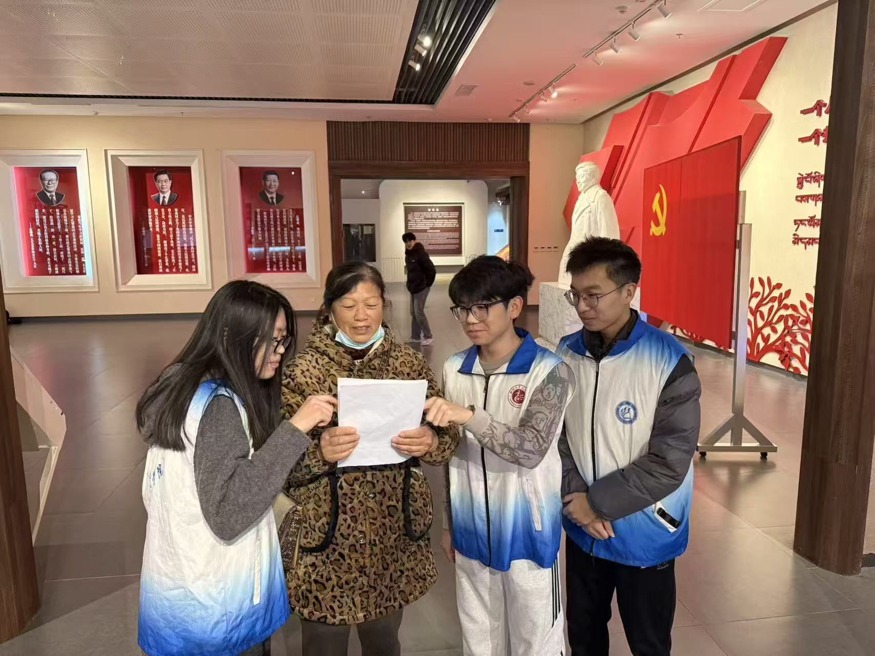 在孔繁森纪念馆内,实践小队依次参观“雪域高原铸忠魂”“齐鲁大地留美名”“时代回响续华章”等主题展区,跟随讲解员脚步,观览孔繁森身穿藏装与群众劳作的旧照,以及磨损的藏靴、泛黄的工作笔记等深刻反映孔繁森同志两次援藏、扎根雪域十余年的奋斗足迹与为民初心的珍贵实物。基于观览学习的心得收获,实践队员围绕“新时代青年如何践行繁森精神”等主题展开讨论,将崇敬之情转化为思想共鸣与行动自觉,并通过纪录片、口述史资料,系统梳理孔繁森“忠诚于党、热爱人民、清正廉洁、艰苦奋斗”的精神内核,积极引导团队成员及学院广大青年学子写下感悟,以英模为榜样,在新时代建设中贡献青春力量。