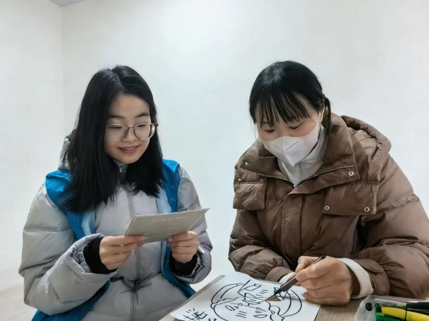 在知识科普环节,志愿者向群众讲解《荷花三娘子》故事梗概,重点阐释荷花所承载的文化意象与精神内涵,并展示聊斋非遗展中荷花主题文创图片,以生动讲解带领群众走进古典文学意境,拉近群众与聊斋文学的距离。志愿者引导群众分为两组参与实践创作,一组用彩笔在帆布上绘制荷花池、书生遇仙等场景,另一组用刻刀、颜料在葫芦上雕刻符咒纹样或“福禄”字样,制作聊斋主题非遗葫芦摆件,使群众在动手实践中体悟聊斋文学的深厚内涵,领略传统非遗技艺的工艺价值与文化意蕴。为进一步强化文化体验,活动特别设置情景演绎环节。参与群众依托现场创作作品搭建“聊斋秘境”实景,分别扮演书生、荷花三娘子等故事角色,在志愿者的旁白解说下进行沉浸式情景再现,让聊斋文化在情景交融中更具感染力与传播力。志愿者为参与群众颁发纪念礼品,现场互动热烈、氛围浓厚。