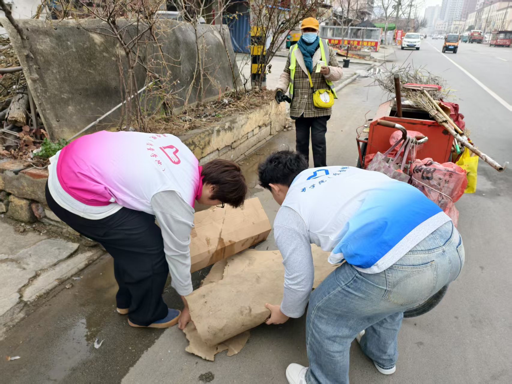 与此同时,志愿者们分组行动,积极投身环卫实践,捡纸屑、整理纸板纸壳、清扫垃圾,大家分工协作、干劲十足,以实际行动分担环卫工人工作压力、为城市洁净助力。服务间隙,志愿者们还与环卫工人围坐交谈,倾听工作日常与难处,深入了解其日复一日的坚守与付出,让环卫工人感受社会关怀与温暖的同时,也让志愿者们在实践中深刻体会到了一线劳动者的辛劳,进一步领悟学习了雷锋精神与志愿服务精神。