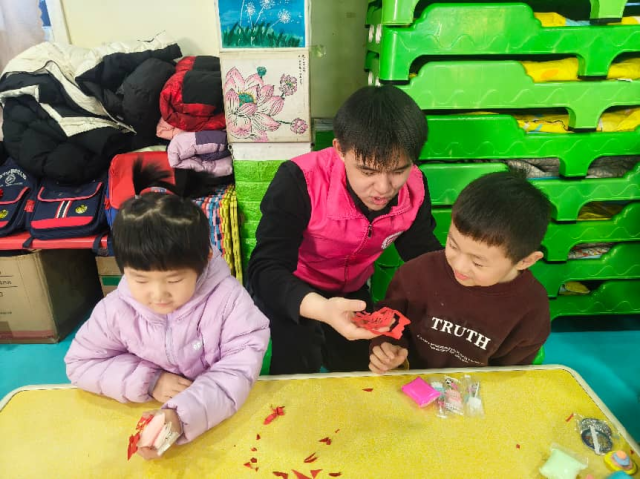 本次活动以剪纸为载体搭建文化传播桥梁。志愿者将儿童创作的各类剪纸成品按福字、生肖、花鸟三种图案类型分区摆放,同时准备好标注剪纸寓意的简易讲解卡片。在讲解环节,志愿者向群众简要介绍活动,以非遗剪纸传递温情,邀请群众驻足欣赏,针对在场的独居老人、留守儿童家属,主动沟通走访事宜,细致了解相关注意事项。群众纷纷参与现场剪纸体验,志愿者结合群众的成品进行示范,细致讲解对折、镂空等基础手法,手把手指导群众操作,群众神情专注,指尖认真摆弄彩纸,反复尝试调整,保持热情且主动向志愿者请教技巧,现场氛围热闹温馨。剪纸结束后,志愿者将剪纸作品收集,用于补充文化角装饰。