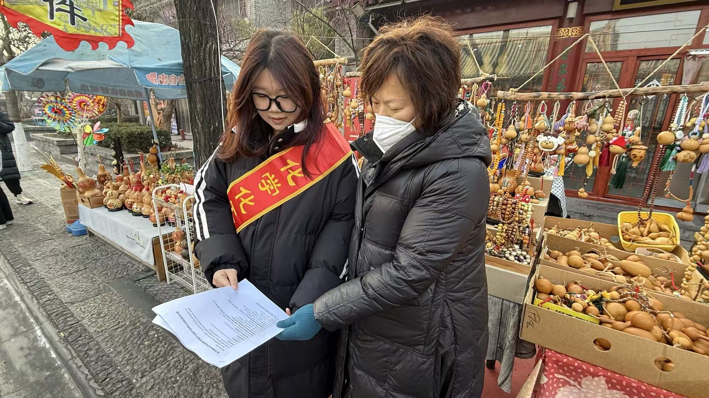 活动前期,志愿者紧扣“非遗文创助力乡村振兴”为核心目标展开筹备,围绕示范区特色产业发展、生态环境治理等核心方向设计调研问卷与访谈提纲,为实地调研打下坚实基础。调研过程中,志愿者采用“线上+线下”相结合的模式,以光岳楼周边文创商圈为核心调研阵地,走进商圈内的非遗工坊与文创市集,与葫芦非遗手艺人面对面交流,记录手艺传承中遇到的困难,以及收集从业者想把产业做大的具体需求。面向往来游客与青年群体,志愿者向他们展示文创样品、发放问卷,了解大家对春节葫芦文创的喜好与市场缺口,全面收集从业者与消费者的双向反馈,为文创开发与产业服务指明了方向。