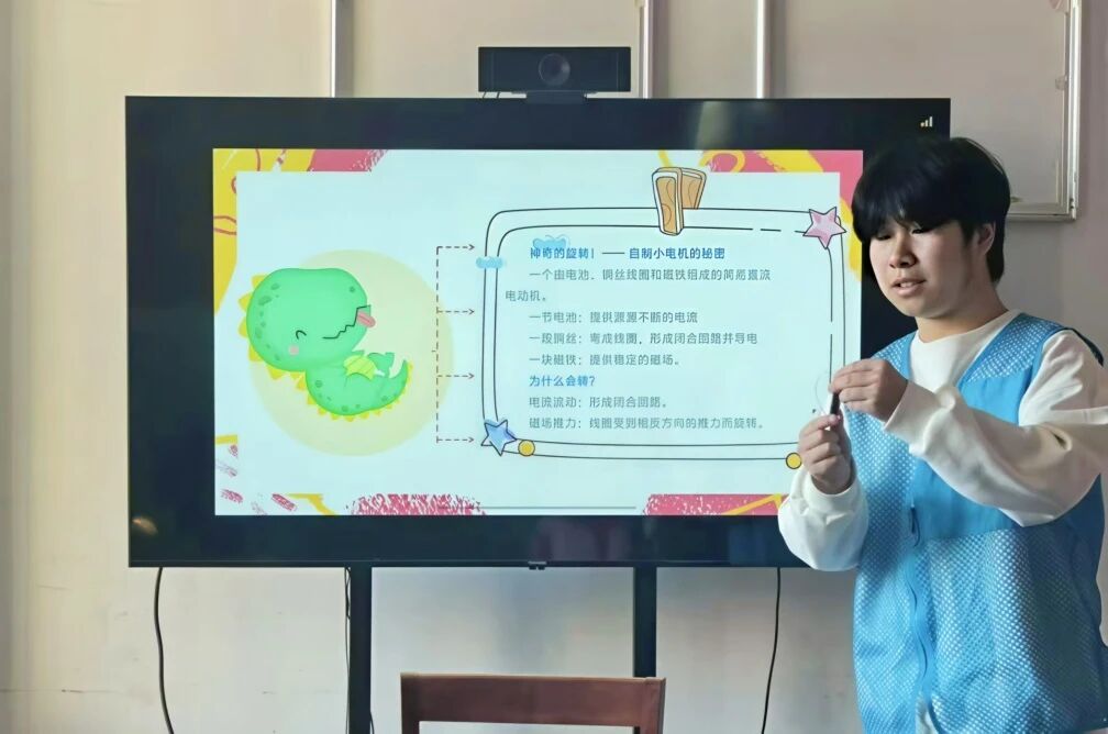 动手实践环节更是将活动推向高潮。志愿者们耐心细致、手把手指导居民利用简易材料制作电动机模型,全程认真解答操作疑问,同步讲解电磁转化等物理原理。大家在亲身体验中感受科技的奇妙与乐趣,现场参与积极、互动频繁、氛围热烈,充分展现了青年学子扎实的专业能力与勇于担当的青春风貌。