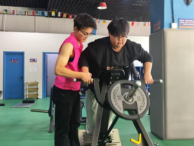 活动以沉浸式实操体验为主线,围绕“学—练—用”的逻辑设计三个层层递进的环节。在“一对一”需求对接环节,志愿者与学生结对交流,围绕器械使用要领、训练计划制定、个体体能差异等内容展开深入沟通。志愿者结合自身健身经验,针对学生的不同基础与目标进行个性化指导,帮助学生树立科学训练的意识。在“专业要领讲解与示范”环节,志愿者从坐姿推胸训练器、T型划船器等核心器械的调节方法、安全防护要点、目标肌群发力原理等关键内容入手,通过分解演示和常见错误纠正,强化学生对动作规范的理解,确保每位学生掌握正确且安全的器械使用方法。在“实操演练与即时纠错”环节,现场设置多个训练体验区,学生在志愿者指导下进行实际操练,将所学知识转化为实操能力。志愿者全程观察动作轨迹,及时指出姿势偏差并给予调整建议,引导学生在反复练习中巩固技能、提升训练效能。活动现场气氛热烈,互动积极。