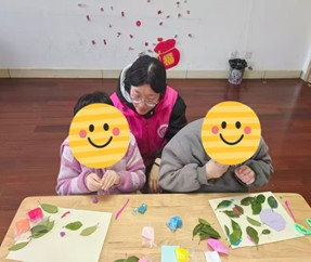 志愿者先向儿童展示了不同种类的树叶标本,用生动的语言为其讲解树叶的生长特点与自然之美,引导他们感受大自然的奇妙馈赠。在制作环节,志愿者主动与儿童轻声沟通,了解他们的喜好,引导他们挑选自己喜欢的树叶。同时,志愿者将复杂的创作流程拆解为简单易懂的步骤,从构思造型、搭配黏土到固定树叶、点缀装饰,逐一示范,并耐心进行手把手教学,帮助儿童克服操作难点。在创作过程中,志愿者还会根据完成情况,适时引导儿童为自己的作品搭配不同颜色的黏土与装饰,让每一件“自然艺术品”都成为独一无二的创作。面对儿童因动作不协调或注意力分散出现的反复,志愿者始终保持极大的耐心与鼓励,现场气氛温馨而融洽。创作完成后,志愿者为儿童分发颜料、亮片等装饰材料,鼓励他们发挥想象力,为自己的作品进行点缀。志愿者全程陪伴在侧,协助完成粘贴、塑形等精细操作,尊重儿童的创意构思。
