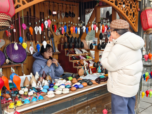 活动期间,服务队成员寻访到一位深耕陶笛技艺的民间手艺人,围绕陶笛技艺的保护现状与民俗文化传承路径,与手艺人展开深入访谈。手艺人娓娓讲述了自己与陶笛结缘的初心、半生坚守技艺的历程,以及传承过程中遇到的挑战与收获。同时,结合摊位上陈列的各式陶笛,手艺人详细讲解了乐器的形制特征、发声原理,以及背后承载的地域文化寓意,让队员们对这项传统艺术形成了系统且立体的认知,真切体会到民间手艺人的匠心坚守与文化温度。