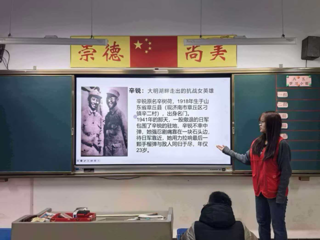 活动现场,服务队成员以章丘革命烈士陵园、辛锐纪念馆等本土红色地标为引,抛出“为何要读懂家乡的红色人物”这一核心命题,迅速唤起同学们的探究热情。随后,他们通过PPT生动展示,带领大家走近巾帼英雄辛锐:从爱国学生到八路军战士,她以笔为刃、以身为炬,最终在大青山突围战中壮烈牺牲,其出众的文艺才华与坚不可摧的革命气节令人肃然起敬;同时,成员们还深情讲述开国少将李曼村带领家乡群众抗日救亡、驰骋解放战争战场的战斗历程,以及马耀南投身抗日事业、组建山东人民抗日救国军第五军的革命壮举。活动尾声,成员们提炼出章丘红色人物“家国担当、不怕牺牲、扎根人民”的精神内核,并结合当代青年的责任使命进行深度解读,让红色精神在新时代焕发出鲜活的生命力。