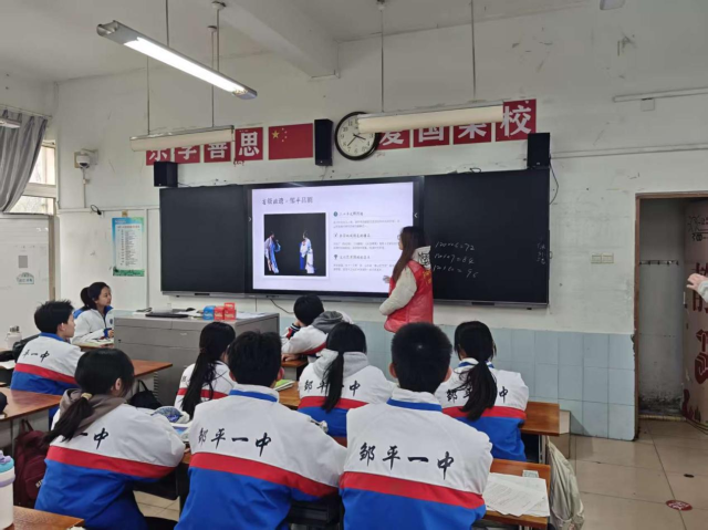 活动伊始,志愿者首先参观了学校走廊“挺膺担当励青春”主题展板,通过图文介绍、成果展示,全面了解邹平一中的校园文化、办学特色与学生风采,近距离感受学校深厚的文化氛围。随后,非遗文化宣讲课堂正式开始,本次宣讲以“金·薪火永续·时代新声”为主题,以省级非物质文化遗产——邹平吕剧为重点,志愿者细致讲解邹平吕剧的历史起源、发展脉络、唱腔特色、表演形式及经典剧目,结合图文展示、历史讲解与艺术特点分析,让同学们深入了解吕剧的起源、发展与艺术魅力,感受地方戏曲的文化底蕴与独特韵味。