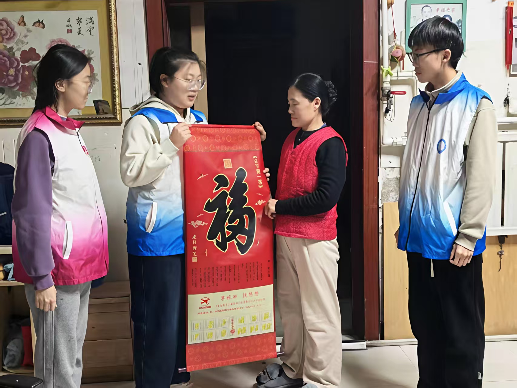 活动开始,实践队员们带着精心准备的手写春联、福字与新春挂历,沿着乡间小道走访慰问乡村老人。每到一户,队员们主动帮老人打扫卫生、整理屋内杂物,将寓意吉祥的春联、福字和挂历送到老人手中。大家耐心与老人拉家常,细致询问身体状况、取暖情况和年货准备情况,为老人解读春联里的美好祝福。活动现场墨香浓浓,队员们还现场挥毫,为老人书写春联和福字,将新春祝愿融入笔墨之间。老人们看着喜庆的春联和热情的队员,脸上满是幸福笑容,屋内洋溢着温馨欢乐的气氛。此次活动以传统年俗为纽带,既为老人们送去了温暖与关爱,也让浓厚的新春氛围传遍乡村,彰显了青年学子的责任与担当。