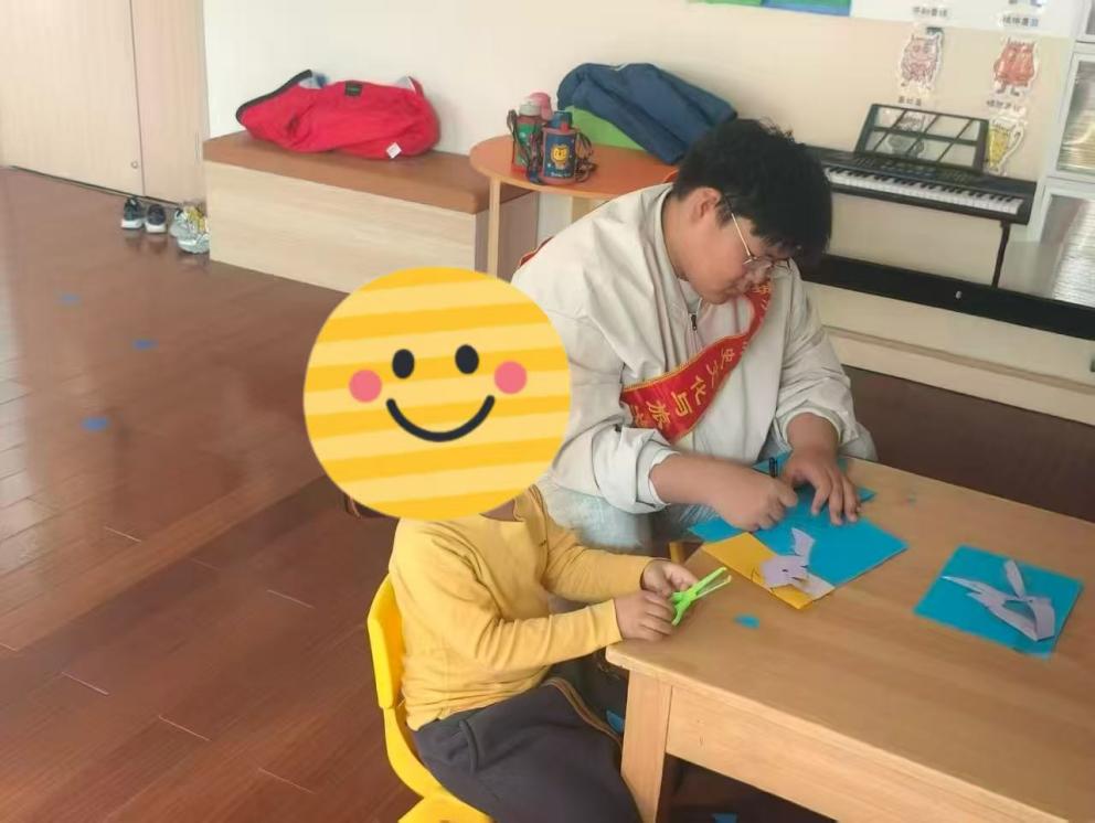 活动设置创意手工与律动模仿两个环节。志愿者先将印有小兔、青蛙、小鸟等动物轮廓的彩色卡纸与安全剪刀摆放在桌子上。在示范操作环节,志愿者手持剪刀,沿虚线平稳裁剪,指尖轻压纸面,将动物轮廓完整取下。在志愿者的一对一指导下,儿童自发跟随动作,捏住剪刀手柄,沿线条慢慢裁剪,志愿者俯身轻扶儿童手腕,调整发力角度,抚平纸面褶皱。完成图案制作后,儿童将动物图案对准展示卡,均匀涂抹固体胶,按压图案边缘,志愿者用刮板轻刮表面,使粘贴更加平整。进入律动模仿阶段,志愿者播放背景音乐,调节播放音量。伴随着轻快节奏,儿童手持小兔卡片,双脚交替离地跳跃;手持青蛙卡片,屈膝下蹲再向上起跳;手持小鸟卡片,舒展双臂上下摆动。志愿者分步示范动作,带领儿童重复练习,并及时调整儿童的肢体姿态,规范动作细节。儿童拿着作品站在台前,依次进行展示。