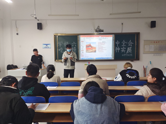 主持人播放党的视频,带领同学们重温大会盛况,接着通过展示ppt的方式带领大家学习《人民日报》中有关党的十九届六中全会精神的论述,共同探讨全会精神。随后主持人分别从党的历程、党的历史故事、党的历史影像三个部分深入介绍中国共产党百年来取得的伟大成就,通过学习伟大的共产党员李大钊的故事,与同学们一同感悟共产党员的初心和使命。主持人在问答环节中,通过“党的宗旨是什么”、“坚持四项基本原则的核心是什么”等问题帮助同学们加深理论学习的印象,并以“击鼓传花”的形式邀请同学上台分享自己的学习心得。同学们在分享中纷纷表示,要继续深入学习党的十九届六中全会精神,向先辈楷模学习,扎实自己的专业知识,不断提高自己的思想觉悟和政治素养,做到行知合一,将自己学到的知识应用到服务祖国建设现代化强国的新征程中。