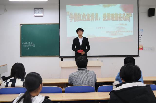 一二九运动是一场由中国共产党领导的大规模学生爱国运动,掀起了全国抗日救国的新高潮。为深入感悟一二九运动所体现的精神,激发同学们的爱国主义情怀,12月9日,历史文化与旅游学院于6号教学楼A405教室举办“争做红色宣讲员,爱国理想在心间”宣讲比赛。