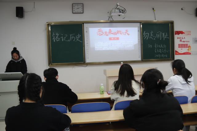 一寸山河一寸血,不忘曾经烽烟起,心中长鸣警钟声。为坚定同学们“勿忘国耻吾辈自强”的信念,激发同学们的爱国热情,引导同学们铭记历史,缅怀先烈之志,12月16日,历史文化与旅游学院于6#A302教室举办“铭记历史,勿忘国耻”纪念活动。
