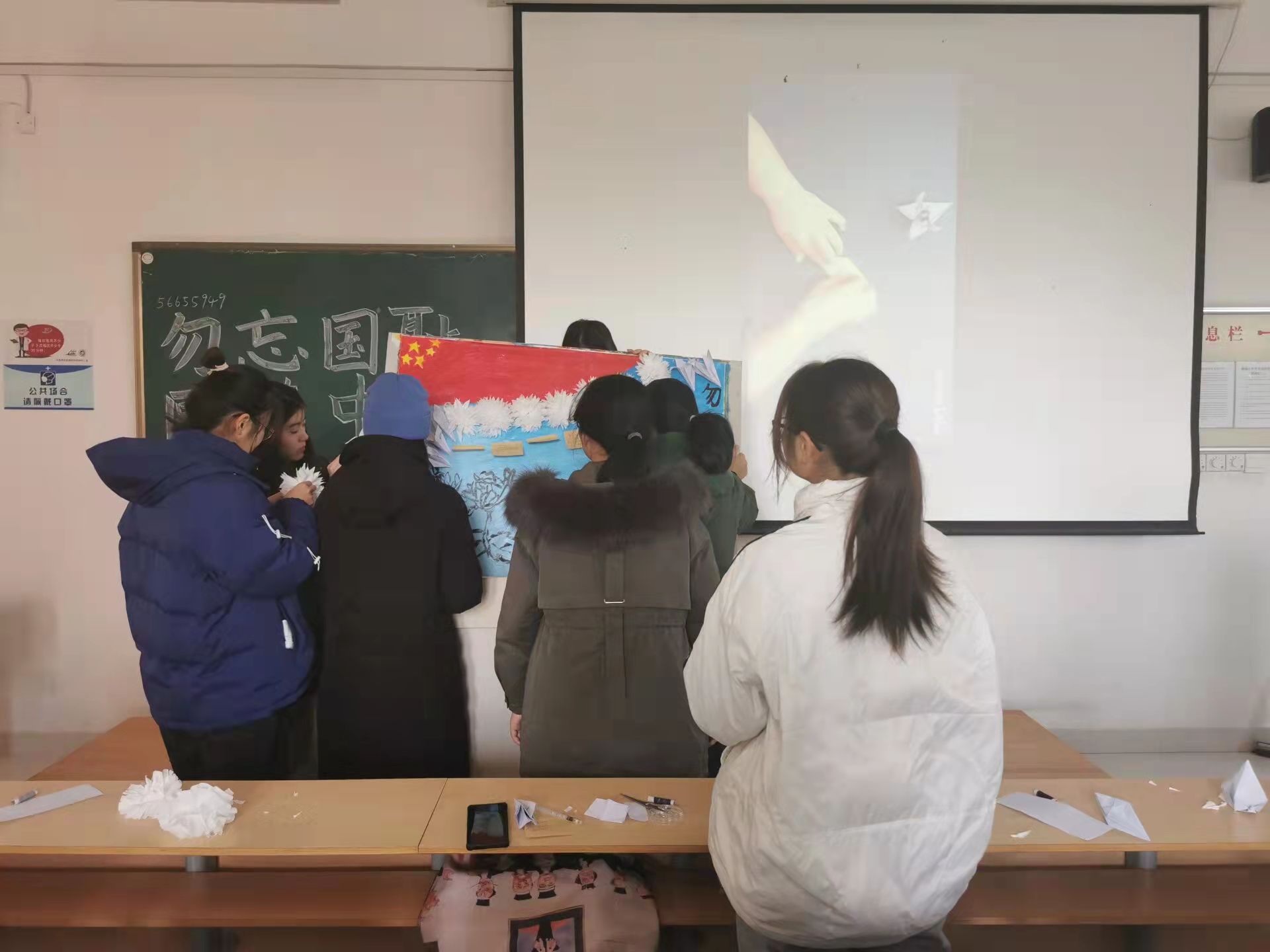 “缅怀英烈祭忠魂,抚今追昔思奋进。”此次活动分为回顾历史和缅怀先烈两个部分。马瑞松以国家公祭日设立的原因为切入点,通过播放南京大屠杀的短片,带领同学们回顾了南京大屠杀的历史背景以及残酷的战争史实,控诉着日本在侵华战争中对手无寸铁的中国百姓犯下的滔天罪行。视频中日军作战的地图、飞机轰炸后房屋倒塌的惨状、屠杀南京人民的各种军刀……一幕幕画面都承载着刻骨铭心的历史,展现着南京大屠杀中的血泪史实。在短片播放完后,同学们利用准备的材料动手完成祭奠所用小白花和纸百合的制作,在便利贴上写下参加本次活动的感想和对未来的憧憬,并将折好的小花和便利贴一起贴到展板上,以此表达对先烈的缅怀和悼念之情。“铭记历史,振兴中华”,“我们应该记住历史,而不是记住仇恨”。一张张便利贴上的话语,一朵朵白色的花,都寄托了他们对大屠杀死难同胞的哀思,表达了他们对不甘屈辱奋起反抗的斗士的敬重。在座的同学们纷纷表示,活动虽然很小,但是他们通过观看视频和查阅史料等,重温了那段历史,明确了自己肩负的责任,并深刻认识到奋发自强的重要意义。
