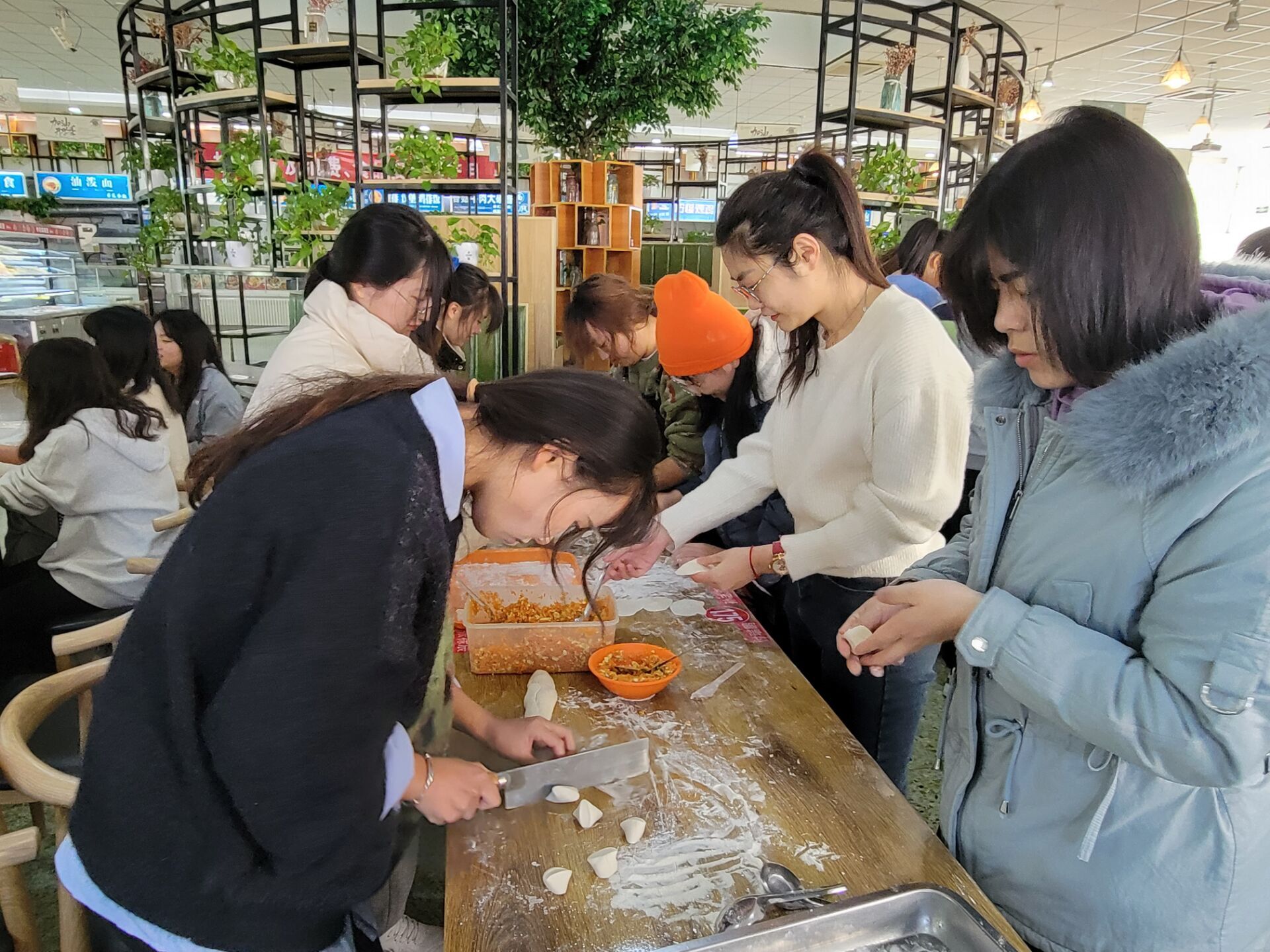 活动正式开始前,师生们遵守疫情防控的要求,进行洗手消毒。组织人员领取食堂提前精心调制的馅料,待一切准备就绪,各小组开始忙碌。活动现场,同学们拿出了早已准备好的面团,与老师们一起擀面皮、包饺子,分工明确、默契协作。老师们更是热情地向同学们分享自己包饺子的经验,同学们虚心学习,老师们耐心指导,活动现场欢声笑语不断。在老师们细致的指导下和同学们的辛勤劳动下,一锅锅饺子制作完成。热气腾腾的饺子出锅,组织人员将热腾腾的饺子端到大家手里,老师们看着同学们开心地吃着自己亲手包的水饺,给予了充分肯定,同学们表示后续也将会继续努力。活动结束后,老师们同学们一起在餐厅合影留念。