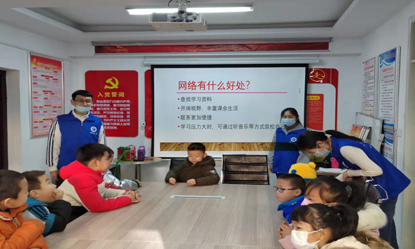 志愿者们与社区工作人员做好沟通联系,确保活动的顺利进行。小朋友们就坐后,志愿者们通过孩子们熟悉的各种网络图标引入,引导孩子们畅谈自己的上网情况。小朋友们畅所欲言,现场十分活跃。随后,志愿者们利用视频、图片等形式展示沉迷网络的典型案例,从多视角、多层次、多种类,生动形象地向孩子们解读沉迷网络的危害,帮助小朋友们提高对不良网络行为的甄别能力,自觉抵制网络不良信息和不法行为,了解沉迷网络的严重危害,了解预防沉迷网络的知识和方式。同时呼吁孩子们要发挥网络的积极作用,避免“网毒”的伤害,在网络交往中,要注重浏览、寻找与学习有关的信息、不应在无关信息面前停留,更不应该在无聊信息上浪费精力,学会抵制网络上的不良诱惑。最后,志愿者们同小朋友们合影留念。