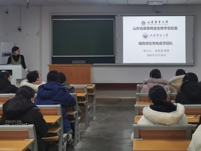 贾泽峰对张修国教授团队的到来表示热烈欢迎,他向同学们详细介绍了张修国教授团队的情况。他要求同学们认真了解研究生复试的注意事项,从专业知识储备、复试面试技巧等方面做好充分的准备,确保能在研究生复试中凯旋而归。他高度赞扬了张修国教授团队取得的科研成就,鼓励同学们向张修国教授学习,勇攀科研高峰,为建设创新型国家做出杰出贡献。张修国教授团队详细介绍了蔬菜病虫生物学、植物微生物免疫学、菌物学等研究团队的情况,从实验室情况、研究方向、承担课题、实验室条件、研究成果、国际合作、研究生的培养计划七个方面作了讲解。孟哲博士和艾聪聪博士则从学生视角出发,给同学们提出切实有效的复试建议以及复试时需要注意的有关事项。本次活动中,同学们听的兴趣盎然,对科学研究充满了好奇和热情,他们争先恐后的举手提出自己想了解的问题,张教授等团队进行了耐心的答复。在同学们热烈的掌声中,活动圆满结束。