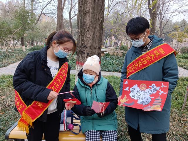 追忆峥嵘岁月,传递红色精神。为培育和强化当代大学生爱国意识,提高大学生志愿者们的手工制作能力,同时进一步增强大学生的社会责任感,肩负起实现中国梦的使命,促使社会上更多的人们生发出对祖国强烈的归属感和认同感,引导人们树立正确的国家观。12月27日,历史文化与旅游学院于聊城市人民公园举办“赓续红色血脉,传承红色基因”活动。