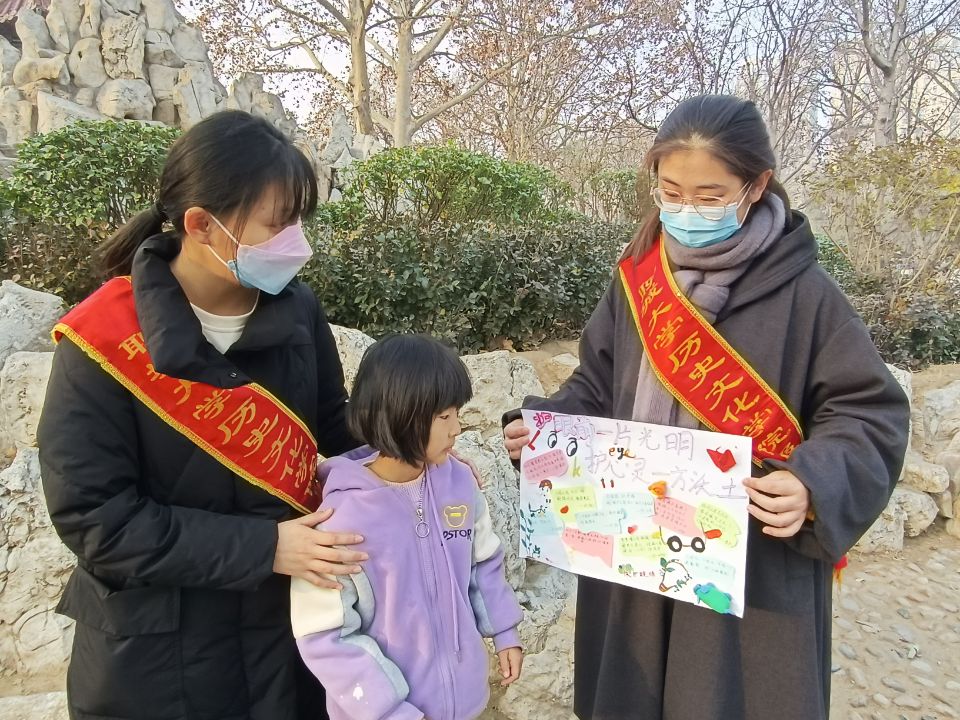 近视低龄化现象日益严重是当今社会一个不容忽视的问题。为给小朋友们普及科学用眼的知识,帮助小朋友养成良好的用眼习惯,提高他们对预防近视的重视程度,1月4日,历史文化与旅游学院于聊城市人民公园举办“护眼前光明,护心灵沃土”儿童视力保护宣传活动,21级3班部分同学参加了此次活动。