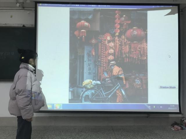 定格烟火处,浓浓年味情。本次活动以线下拍摄提交作品、现场答辩的形式进行。同学们踊跃报名参与此次活动,用镜头记录下春节期间的温暖与幸福。评委们通过线上评选的方式,在众多摄影作品中总共选拔出了四张最具地区特点的优秀作品进行现场答辩。摄影创作者王蕾共有两幅作品入选。王蕾深入日常生活中,将镜头聚焦在热闹的小巷,将冒着热气的食物定格,让照片充满了烟火气息。王蕾表示《尚食》的创作初衷是将春节准备食物的过程记录下来,她认为照片中展现的不仅是春节的美食,照片背后更是蕴含了春节期间每个家庭必不可少的团圆与年味,具有深刻的含义。摄影创作者谈立萍在答辩过程中讲到,此次的摄影作品将街道口购买春联的环卫工人作为了画框中的主角,通过环卫工人向同学们传递了老百姓对春节阖家团圆的期待以及对新的一年的美好愿景。对于将城楼高挂的红灯笼定格,谈立萍解释道灯笼上的祝福语能传达出春节的美好祝愿,更是春节到来的最好证明。