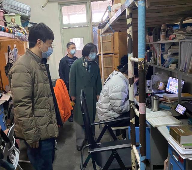 为加强疫情防控期间学生宿舍安全卫生管理,进一步了解同学们的身心状况,3月17日,马克思主义学院党委书记张华筠,党委副书记、副院长范华亮,团委书记宋义明,辅导员李政一一行走访学生宿舍。