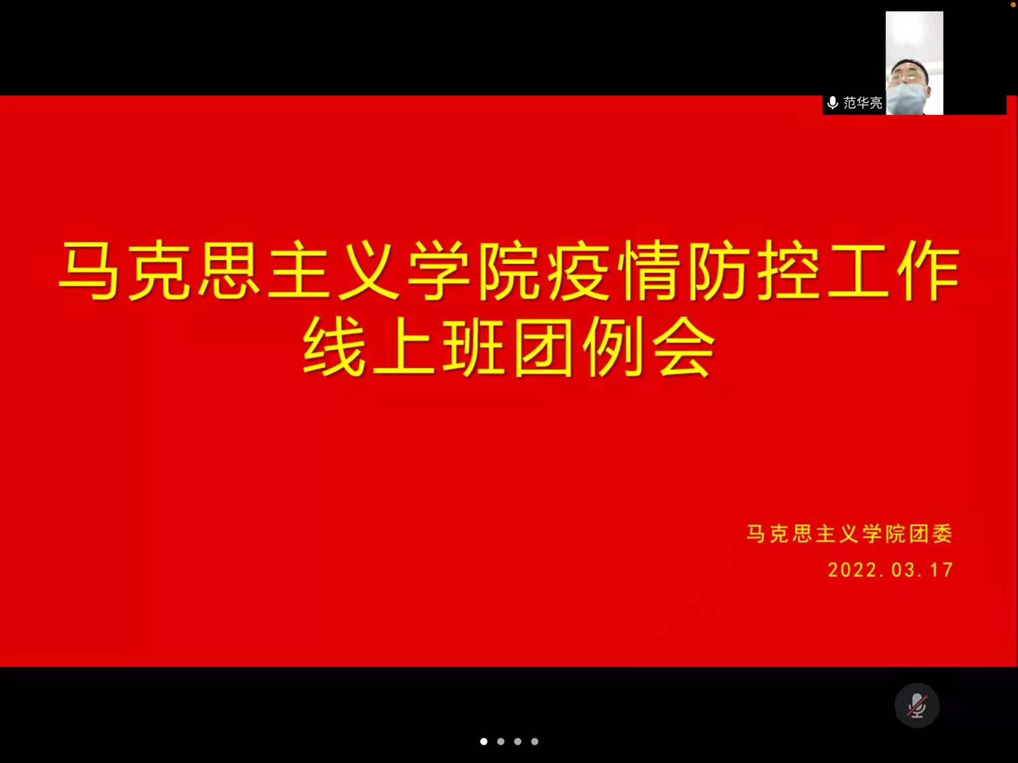 为使同学们进一步了解学院对于疫情防控的具体安排,切实做好疫情防控工作,保证同学们的生命健康安全,体现学院领导对于疫情防控的重视,3月17日,马克思主义学院开展疫情防控工作线上班团例会,马克思主义学院党委副书记、副院长范华亮,团委书记宋义明,辅导员朱晓涵以及全体班团参加本次会议。