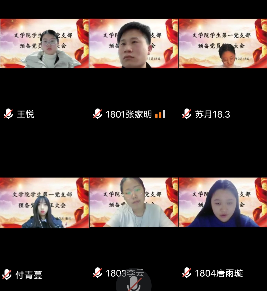 为响应党的号召,为党支部注入新力量,3月18日,文学院本科生第一党支部于线上召开预备党员转正大会。文学院本科生第一党支部书记孙哲,支部委员相飞、胡玥,文学院本科生第一党支部全体学生党员及预备党员参与其中。