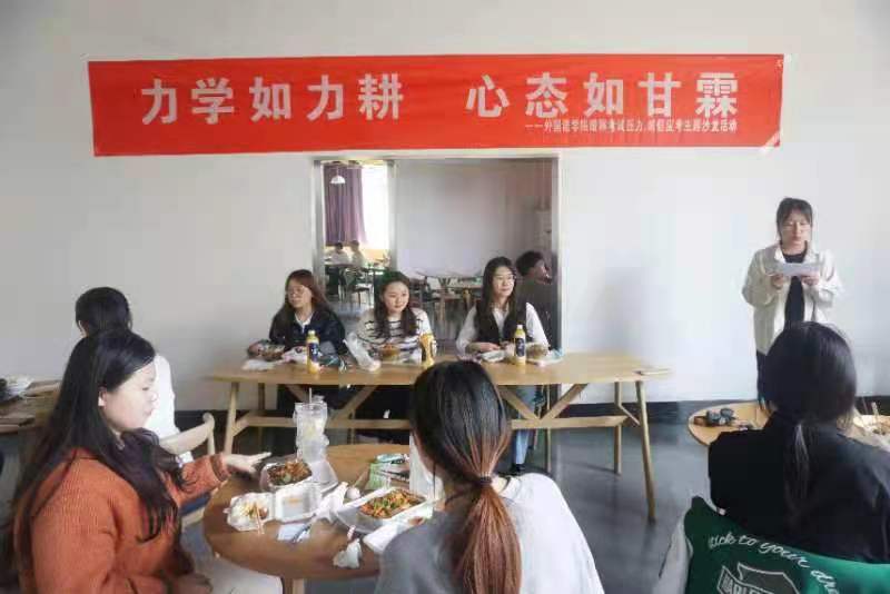 期中考试即将来临,为了鼓励同学们积极应考,帮助同学们调整备考心态,外国语学院于4月21日在湖苑餐厅举办“期中将至书满牍,细耕心理轻应战”心理沙龙活动,外国语学院辅导员岳圆、尚莹、吕超凡老师出席了此次活动,外国语学院部分同学参加。