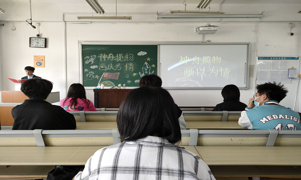 活动围绕知识科普、自主创作与交流感悟等环节展开,科普航天知识,弘扬航天精神。活动过程中,同学们在激昂的音乐声中回顾载人航天飞船返回地球的画面,并在主持人的介绍下了解载人航天工程的发展历程,熟悉聂海胜、刘伯明、杨洪波与王亚平等宇航员的光荣事迹。同时,同学们凭借了解到的内容,进行绘画与海报创作,通过铅笔勾画、水彩上色等方式精心创作“神舟十二”、“摘星”等作品,表达对航天事业的向往与美好祝愿。创作之余,同学们从色彩搭配、绘画技巧等角度对创作灵感、绘画寓意与愿景展现等内容展开叙述,2021级学生徐栋表示,作为青年学子,应持续关注我国航天事业的发展,加深对航天事业的了解,以勇于探索的精神面对未知挑战,用“特别能吃苦,特别能战斗,特别能攻关,特别能奉献”的航天精神托举中国梦。