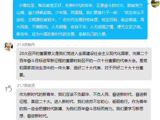 活动开始,活动负责人组织参与活动的同学们在宣传群内观看党的十九大以来我国民生福祉的相关视频,并分析二十大召开对于我国的重要意义,同学们认真聆听习近平总书记所作的工作报告后,表示倍感振奋、深受激励、信心满满,会珍惜学习机会,永葆奋斗精神。随后,活动参加者就十九大以来我国民生层面发生的巨大变迁,总结十九大带给同学们各方面的影响,让同学们更加全面的了解党的光辉历程,并要求同学们书写以二十大以后的美好憧憬为主题的文章以文档形式发送至宣传群内,表达出自身对于祖国繁荣昌盛的祝福与憧憬。随着活动的展开,活动参加者还根据各地特色文化习俗,设计宣传海报,以实际行动迎接党的二十大的胜利召开,积极宣传二十大,切实推动大会精神往深处走、向实处走,参与者杨继正同学表示,自己会贯彻落实会议精神,认真做好本职工作,为祖国的美好未来努力奋斗。