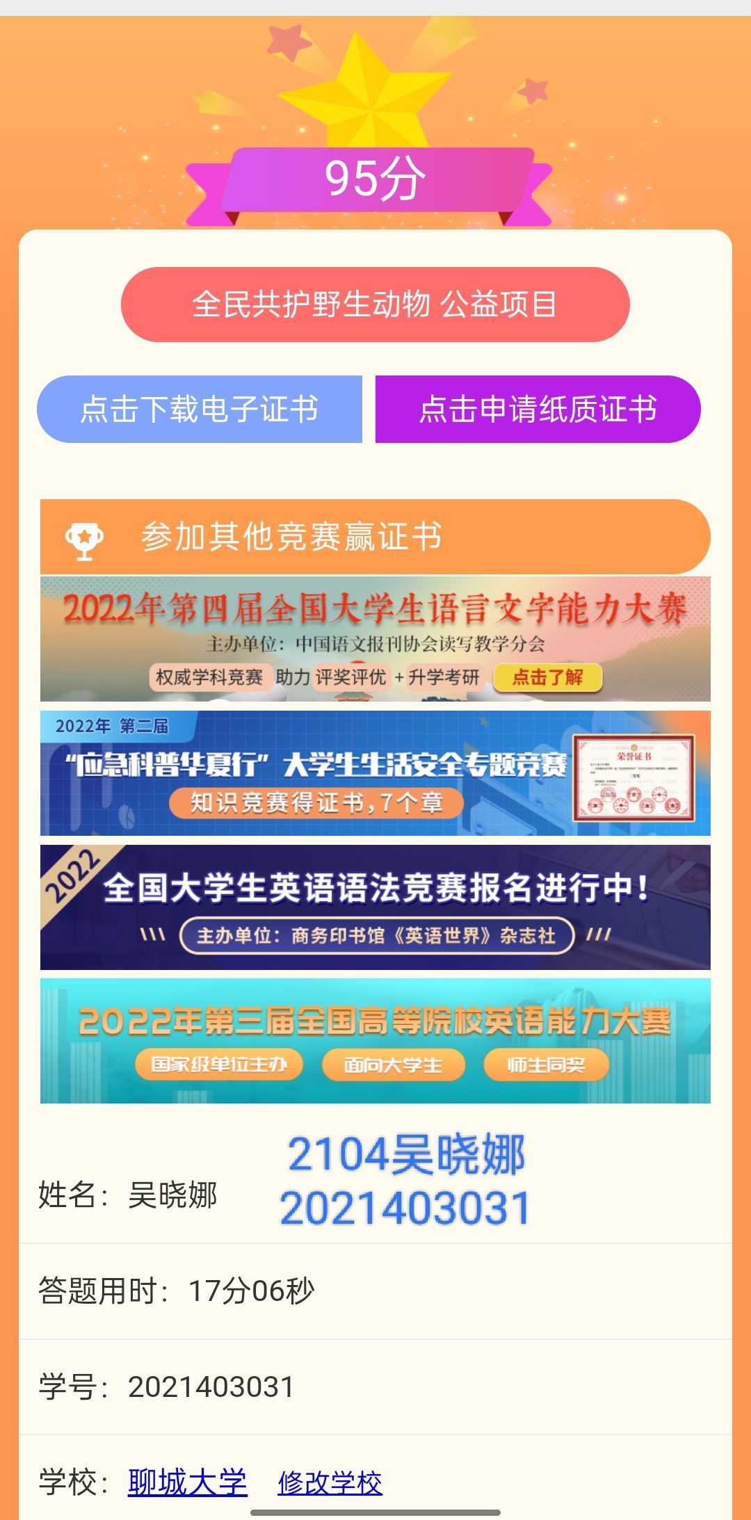 推进绿色发展,建设美丽中国。在活动前期,活动人员提前发布通知,呼吁更多同学能够参与到此次环保知识竞赛中来。同学们踊跃参与,并积极做好赛前准备,通过查阅资料,阅读相关书籍等提前了解并掌握各类环保知识。活动采用线上扫码答题方式,同学们通过扫描二维码进入页面登录答题。根据同学们的成绩截图反馈,同学们对环保知识具有较好的掌握度,这也展现出同学们对于环保事业的支持和推动绿色发展、创建绿色校园的热情。通过答题,同学们也进一步拓展了自身的知识面,更加细致系统地掌握了更多更深层次的环保知识。在活动过程中,工作人员耐心、认真地解答了参与者出现的各种问题,提醒参赛者及时参与答题并保存并上传自己的成绩截图。工作人员与参赛者密切配合,使本次活动顺利举行。