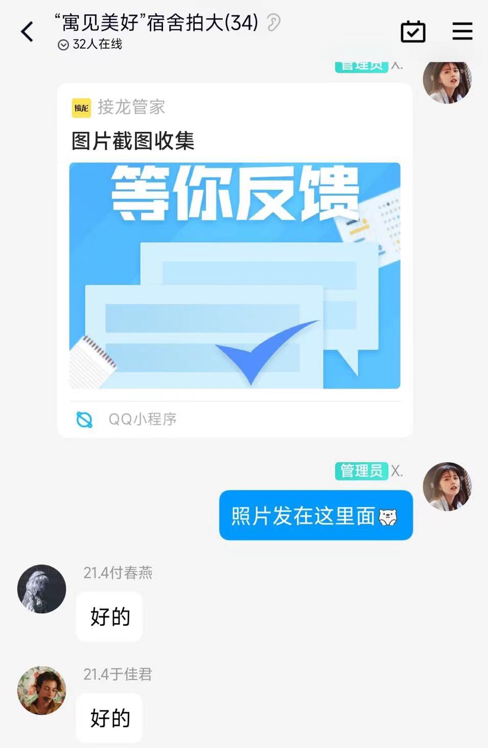 本次活动采取线上的方式,活动组织者在QQ群发布活动要求以及注意事项,活动参与者根据要求使用手机、相机、文字记录宿舍的美好有趣瞬间,并通过文字、漫画、照片、视频等多种形式展现宿舍成员间发生的有趣故事。活动参与者在群内积极回应,分享和舍友之间发生的有趣温馨故事。各参赛队伍及时将拍摄的符合活动要求的照片、视频、漫画上传至QQ群,同时还带有关于分享的照片的详细解说,同学们纷纷表示这次活动激发他们对生活的热情,同时增进了寝室成员之间的感情。其中付春燕同学表示快乐的时光虽然短暂,但照片可以留住与宿舍成员间的的温馨美好画面,保持对生活的热爱,积极向上。大家分享完毕,由活动负责人进行收集整理并挑选出表现最好的宿舍进行表彰,颁发奖状并让各宿舍之间进行相互学习,同时告诉大家珍惜时光,多用相机和文字记录大学生活。