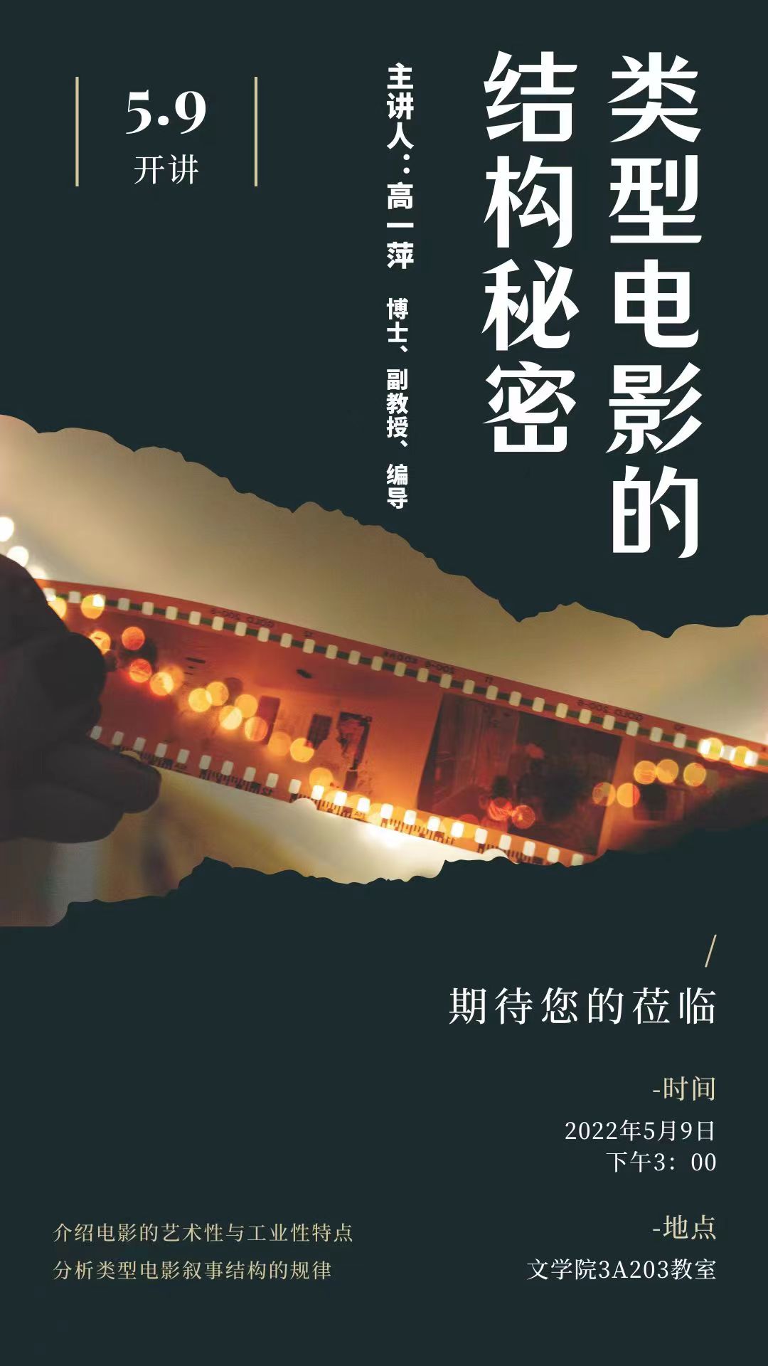 为开阔学生视野,深化同学们对类型电影及其结构的了解,提高同学们欣赏与解读电影艺术的能力,5月9日,文学院于西校区3#a203举办“类型电影的结构秘密”主题讲座。高一萍副教授担任主讲人,文学院副院长殷学明参与此次讲座,文学院部分同学参与其中。