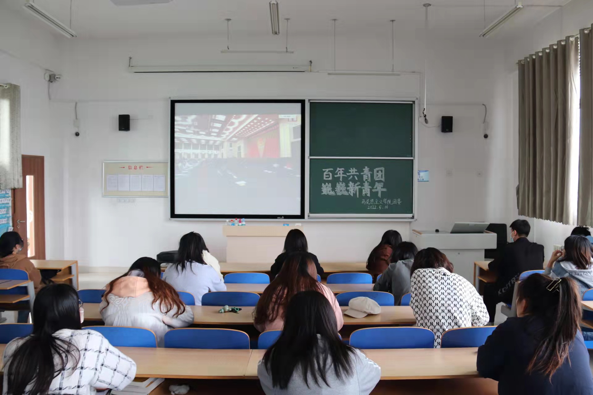 马克思主义学院积极组织全体学生观看庆祝中国共产主义青年团成立100周年大会,部分学生于教室观看,支教实习生以及其他学生于线上观看,共同聆听习近平总书记重要讲话,全体人员凝神贯注、聚精会神,认真记录讲话要点,感悟中国共青团百年光辉历程。