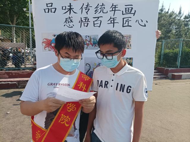 文化净土众守护,迎请年画薪火传。活动负责人从网上查找并整合有关年画的起源发展内涵的资料,提前学习木版年画的有关知识,如年画的起源、不同地区流派的特点,不同流派的绘制风格等,了解年画所蕴含的精神,将有关年画影像图像进行简单的文化内涵介绍并打印,有次序的粘贴到展板上。有的负责人向同学们讲解年画图片中所蕴含的民间信仰和具体内涵,被采访的同学们结合先前的讲解学习和感受,提出对于某一年画作品内涵的理解有疑惑的地方。有的负责人负责宣传讲解有关木版年画的具体内容,在已有的基础上尽力为同学们解答疑惑。另外,他们还邀请同学们根据自己的感悟和思考,画出自己的木版年画或者设计出自己的构图,并现场采访同学们对于木版年画这一传统文化所持有的相关观点。同学们纷纷表示,没想到看似简单的一张年画,却蕴含着无穷的奥妙,年画体现了劳动人民的智慧、期盼和价值认同。一张画就是一个故事、一张名片、一种民心的向往和一个文化教科书。其他负责人负责书法的调查问卷,采访同学们对木版年画的了解程度,完成调查问题并统计结果。活动结束后,负责人朱晓彤表示通过与传统文化零距离的接触,不仅深切感受了中华传统文化的博大精深与独特魅力,也在潜移默化中提升了自己的艺术认知。