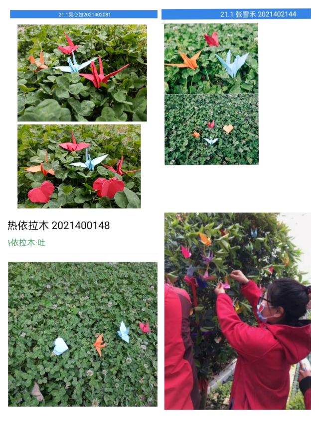 本次活动以折纸为依托,帮助同学们送出爱的祝福。组织人员向同学们讲到,折纸具有美好寓意,比如爱心代表感恩生活、祝福他人,千纸鹤承载着对他人的祝愿。同时,组织人员告知同学们折纸的技巧,耐心细致地讲解和示范折纸方法。 组织人员讲解细致深入,耐心诚恳,同学们也积极学习,通过不断的学习,慢慢熟练翻转和折压,基本掌握了折叠爱心与千纸鹤的方法。利用组织人员提供的彩纸,同学们折出大量千纸鹤和爱心。在组织人员的带动下,同学们将自己对疫情结束的期盼落在折纸上,并将折纸们穿成长串,挂在学校的树枝上或者矮木丛中,送出自己的美好祝愿。为进一步表达祝福与希望,同学们也相互交换爱心与千纸鹤,传递爱的祝福。折纸虽小,情谊千斤,虽然疫情的冬天仍未过去,但我们终将凭借心中的热火,度过这个漫长的季节。