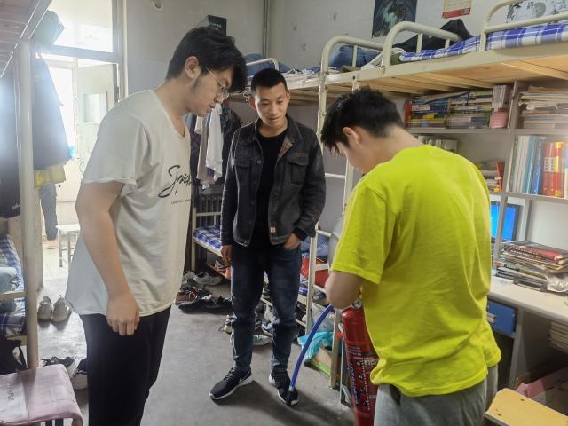 为保证抽查结果的真实性,本次活动并未提前下发通知。活动当天,活动组织人员携带提前准备好的灭火器来到宿舍楼,经宿舍内同学同意后进入宿舍,询问同学们是否了解如何使用灭火器,并邀请同学们现场演示灭火器的使用方法。在同学们演示完成后,志愿者指出参与同学使用方法的错误之处,并进行规范演示。经过各楼层随机抽查发现,大部分同学都可以正确并熟练的掌握灭火器的使用方法,只有极少数的同学清楚灭火器的使用方法,但使用过程中会出现少量错误,在任庆超老师指正后即掌握了正确的使用方法。“谁知道明天和意外,哪一个先来,”没有人期盼火灾的到来,但所有同学都应学会如何面对火灾。