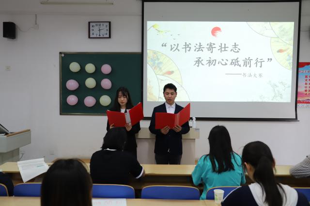 书法雅尚,翰墨千秋。活动在“汉字起源与发展”的短视频中拉开帷幕。从结绳记事到仓颉造字,从甲骨文到篆、隶、行、楷、草种类齐全的演变,同学们既惊艳于先民的无限智慧,又为汉字千年赓续发展、经久不息而欣喜不已。视频播放结束后,主持人邀请同学们上台抽取猜字谜游戏,现场同学们踊跃参与,“一箭穿心”、“山上有山”等字谜引得大家争相作答,现场气氛活跃。随后同学们在主持人的组织下两两一组上台进行繁体字大比拼,感受汉字的“前世今生”,同学们在比赛的同时,也上了一节别开生面的文字课。紧接着,各位同学纷纷上台展示自己的书法作品。一笔一画,或起收简洁、轻重分明;或有快有慢、刚柔并济;或笔力劲挺、风格洒脱;或自然舒展、行云流水。各位同学从自己的创作理念,布局、排版以及写字习惯笔峰等方面展开交流,其中刘蕾同学凭借其精湛的书法技艺,挥洒自如、墨香四溢的书法作品,获得了同学们的一致好评。活动最后,同学们俯身执笔,一笔一画写下对未来的期许,横折撇捺,在同学们的心间传递传统的智慧。
