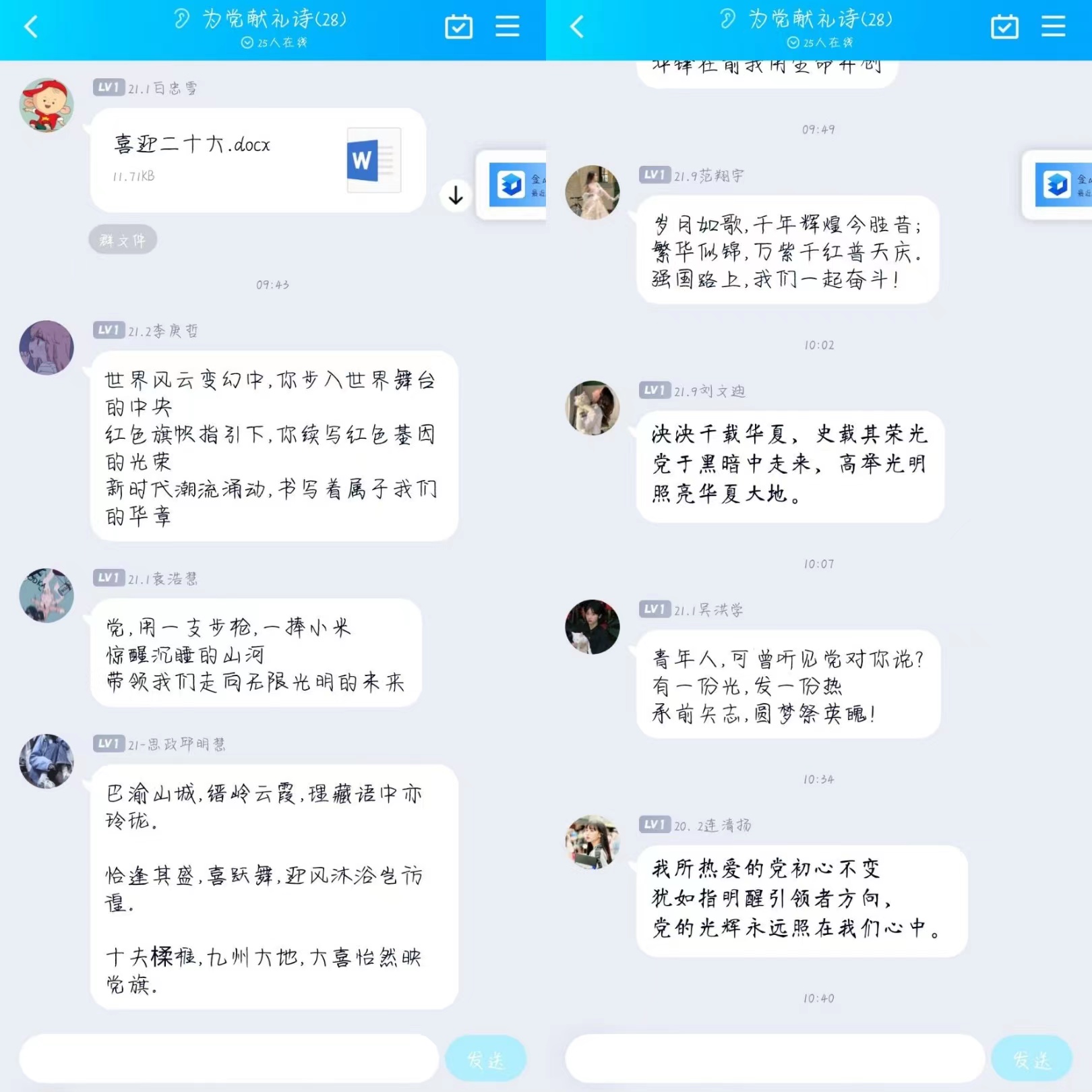 此次三行诗创作活动紧紧围绕“喜迎二十大”主题,以党史为鉴,化红色文化经典为底蕴,创作爱国拥党三行诗。苏启航为参赛者播放《党的百年历程》视频,参赛同学围绕建党百年史,回顾党的光辉历史和丰功伟绩,用三行诗充分表达了自己对党的坚定信仰和对祖国发展的美好祝愿。笔下寥寥三行字,写出了最深情的告白,同学们将对党对祖国的情感倾注于笔尖,赤子之情浸润在字里行间,用最美华章书写出心中最炙热的红色信仰。其中,袁浩慧的作品《歌颂党》字词凝练简洁、句句真情流露,以青年学生的视角,回顾党和国家的伟大成就,展望未来祖国的美好前景,以精悍的文字,展现党如今的辉煌与荣光。这让同学们更加紧密地团结在党中央周围,牢记初心与使命,接续谱写新华章。