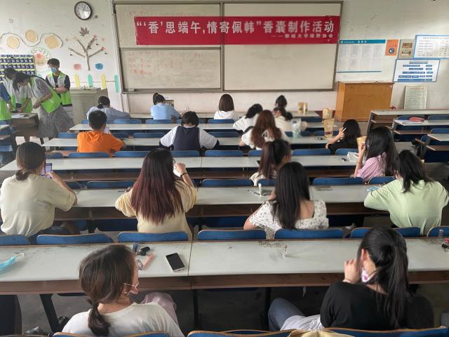 为丰富学生的精神文化生活,传播弘扬中华优秀传统文化,提升学生的文化自信,让学生一起度过一个浓情难忘的端午节,6月4日,聊城大学绿野协会于东校区4#C303举办了“香’思端午,情寄佩帏”端午节香囊制作活动。