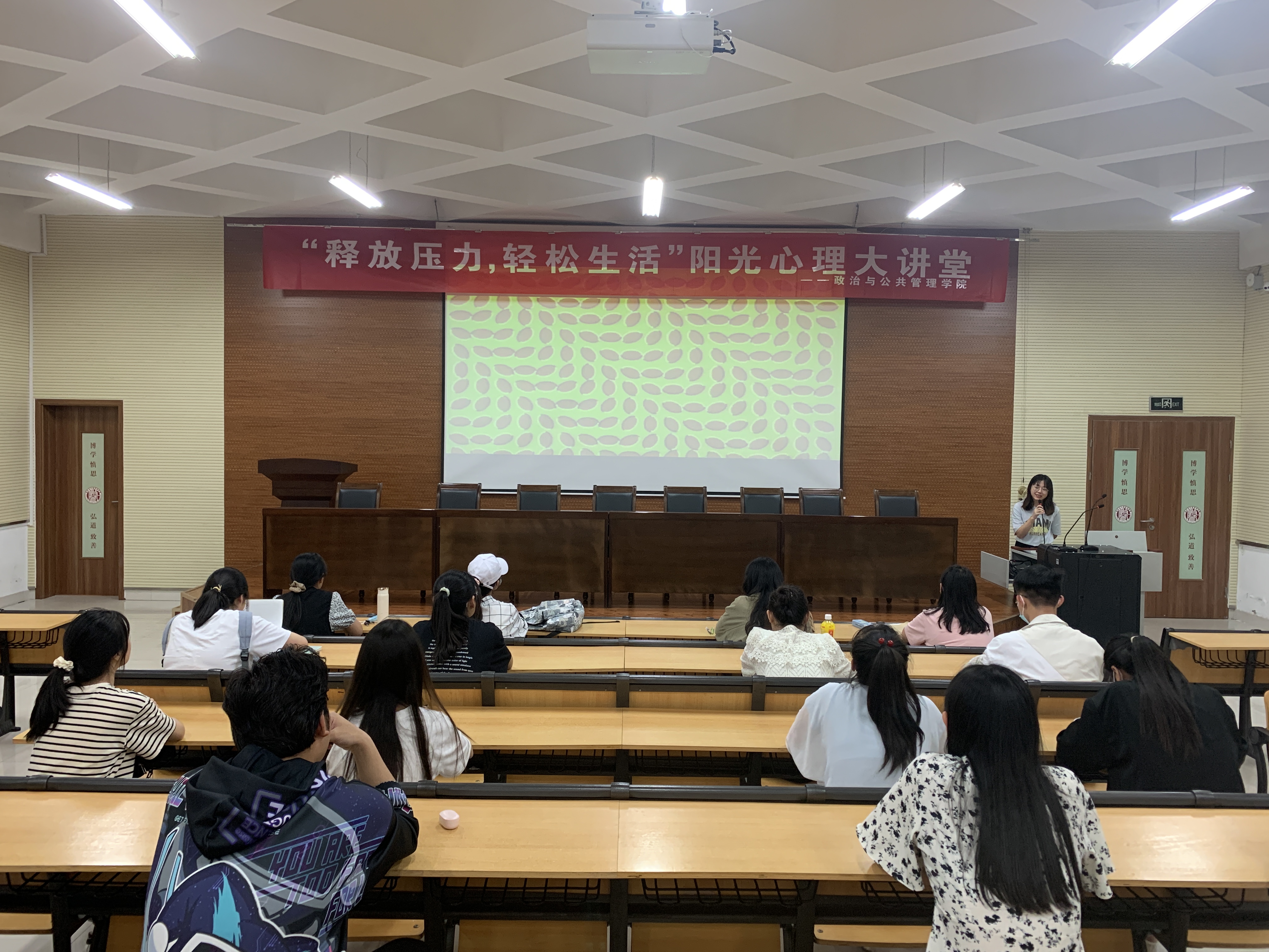 为保障学生的心理健康,缓解学生的备考压力,6月6日,政治与公共管理学院于6#C106举办“释放压力,放松生活”阳光心理大讲堂活动,发展与教育心理学专业研究生耿叶欣担任主讲人,2021级部分学生参与。