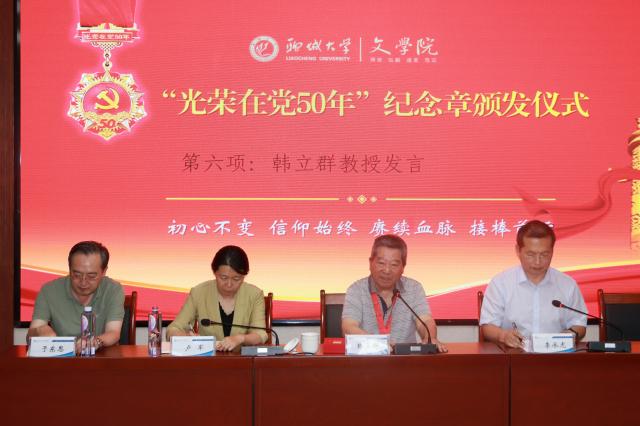 6月23日,文学院积极响应党中央对老党员关心、关怀和褒扬的号召,从政治上激励、精神上鼓舞广大党员进一步增强党员的荣誉感、归属感、使命感,于3#C125会议室庄严举行“光荣在党50年”纪念章颁发仪式。“光荣在党50年”纪念章获得者聊城师范学院中文系原主任韩立群教授,文学院领导班子成员,全体教工党员,学生党员代表参加仪式。